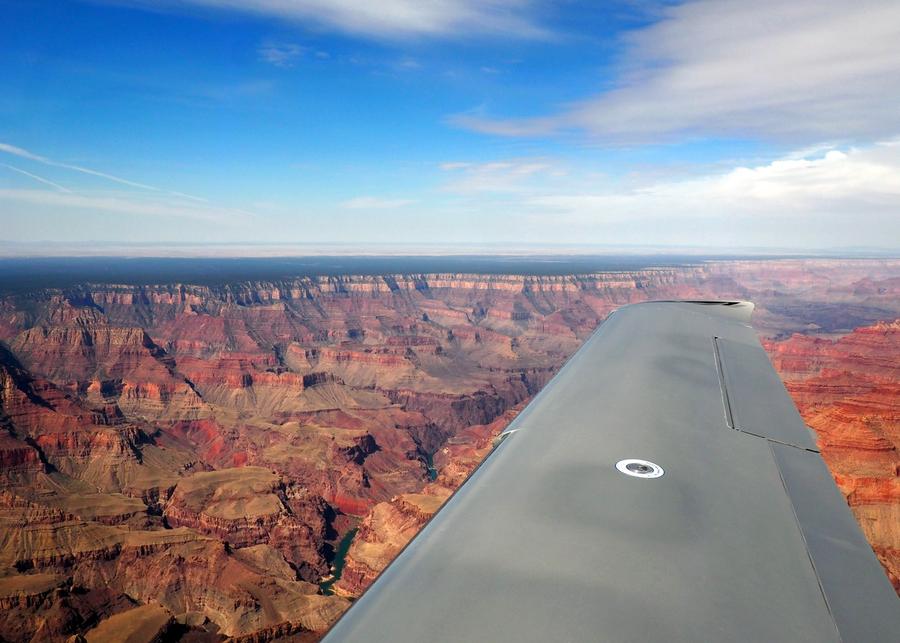 På grunn av flere ulykker og nestenulykker som følger av at ymse luftfartøy har kommet farlig nære hverandre, fikk vi ikke fly akkurat slik vi ville over Grand Canyon. Vi måtte følge en bestemt luftkorridor, og her lot vi autopiloten ta seg av flyginga, mens vi mest bare nøt utsikten. Å fly over Grand Canyon er kult. Ekstremt kult!